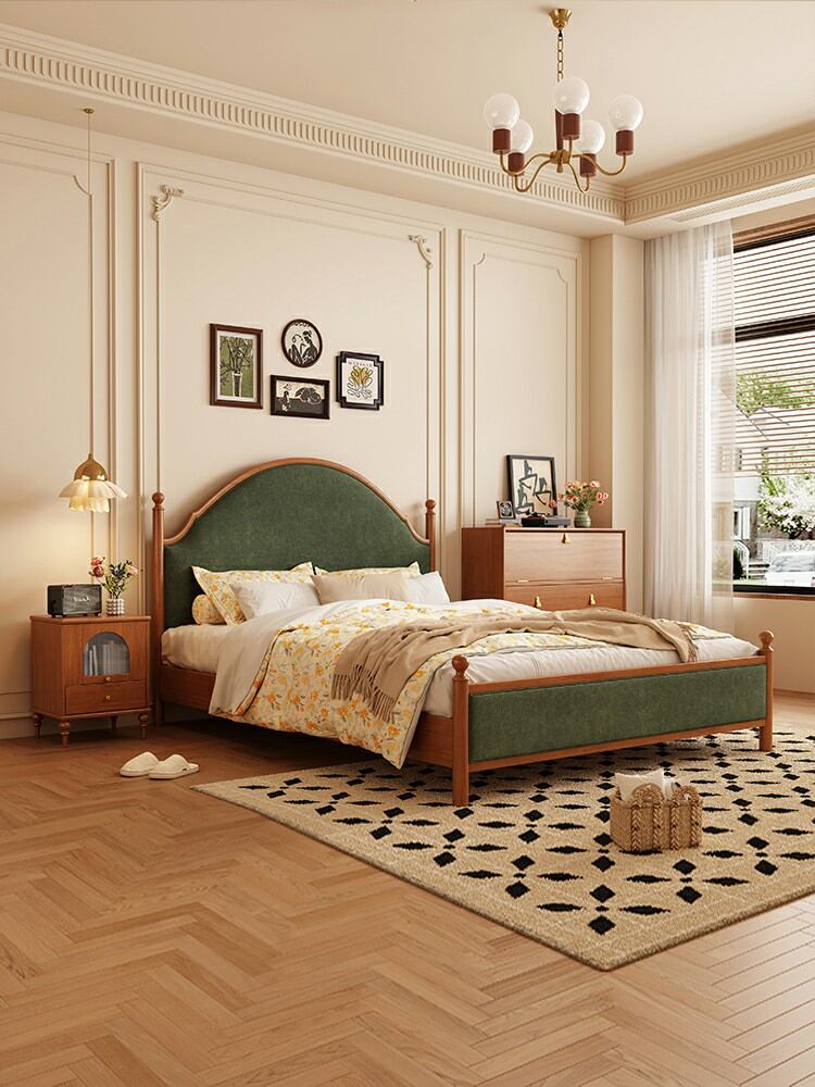 Vintage French Style Double Bed Wooden Velvety Rubberwood Marriage Bed