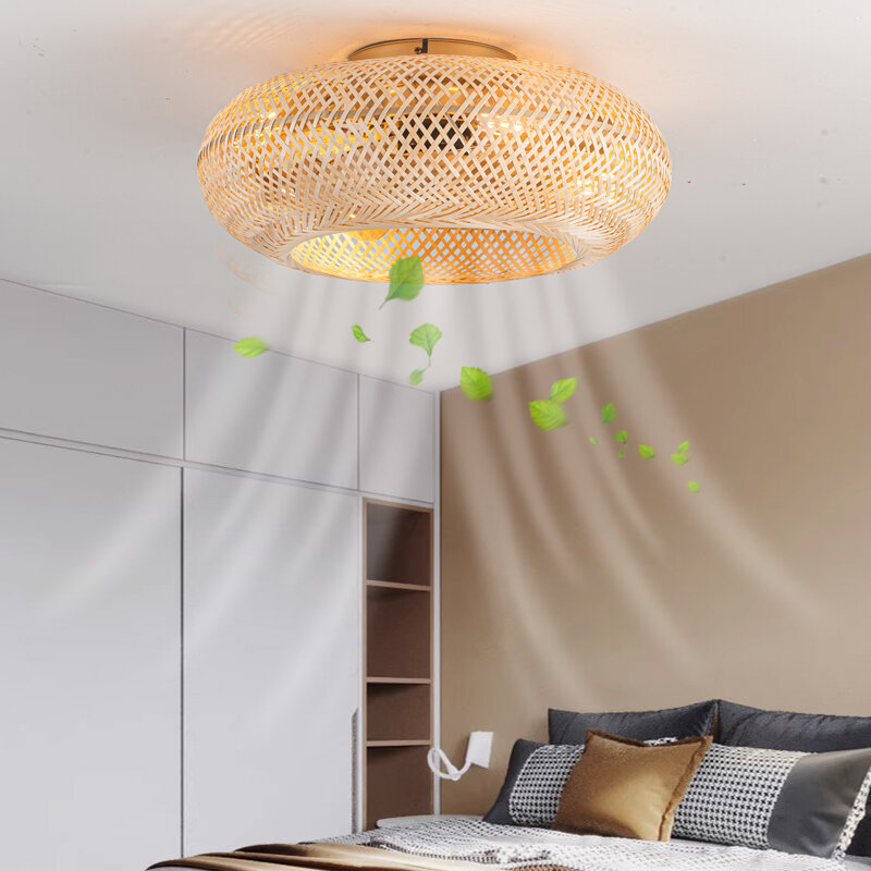 Invisible Bamboo Woven Ceiling Fan Light Bedroom Restaurant Living Room Decorative Hanging Fan Lamp Modern Minimalist Style